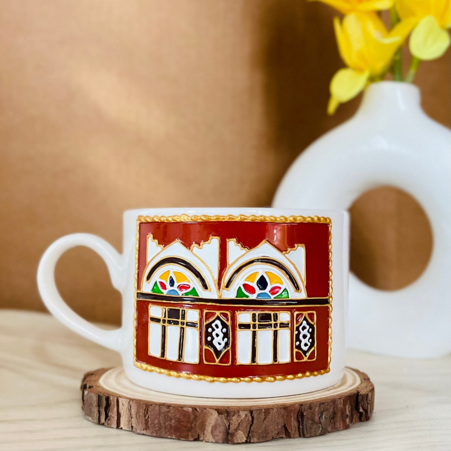 كوب مرسوم يدوياً بنوافذ صنعاء القدبمة مع صحن سادة